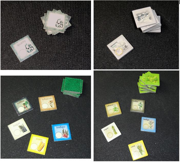 | 波多黎各(左)與波多黎各10周年版(右)的玩家圖板細部: 農田區與建築區 |